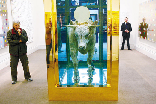 ÇÑ °ü¶÷°´ÀÌ ¼Û¾ÆÁöÀÇ Á¤¼ö¸® ºÎºÐ¿¡ µÕ±Ù 18k ±ÝÀå½ÄÀ» ´Þ¾Æ °Å´ëÇÑ À¯¸®»óÀÚ¿¡ ³ÖÀº Ç㽺ƮÀÇ ÀÛǰ¡´±Ý¼Û¾ÆÁö(The Golden Calf)¡µ¸¦ º¸°í ÀÖ´Ù. ÀÌ ÀÛǰÀº 15ÀÏ ·±´ø ¼Ò´õºñ °æ¸Å¿¡¼ ÃÖ°í°¡ÀÎ 184¾ï¿ø¿¡ ÆÈ·È´Ù.