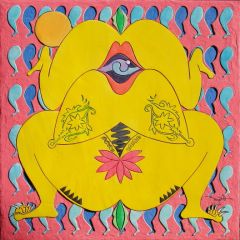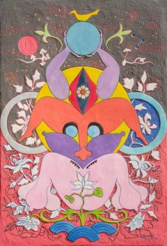 I use the combination form of the man and woman, I with creation and change of space all things show a disappearance from here, and I used simply color and distorted form and the simply form. From here the yellow means the centers in five directions from positive and negative principles five line. To center of the woman the lotus flower and the lightning bit and the spring which symbolizes the sex came to draw. To the breast the spirit pattern form is coming to draw like tattooing. To the hip of the woman there is fecundity and a genitals and the deferment which means rich and noble bites and (the saw tooth bit,) is coming to draw. To above with the body of the woman is undersized differently relatively and there is features of the male who is not decease appearance. Character the fleshy inside of the thigh of the numerous woman means the birth human being.